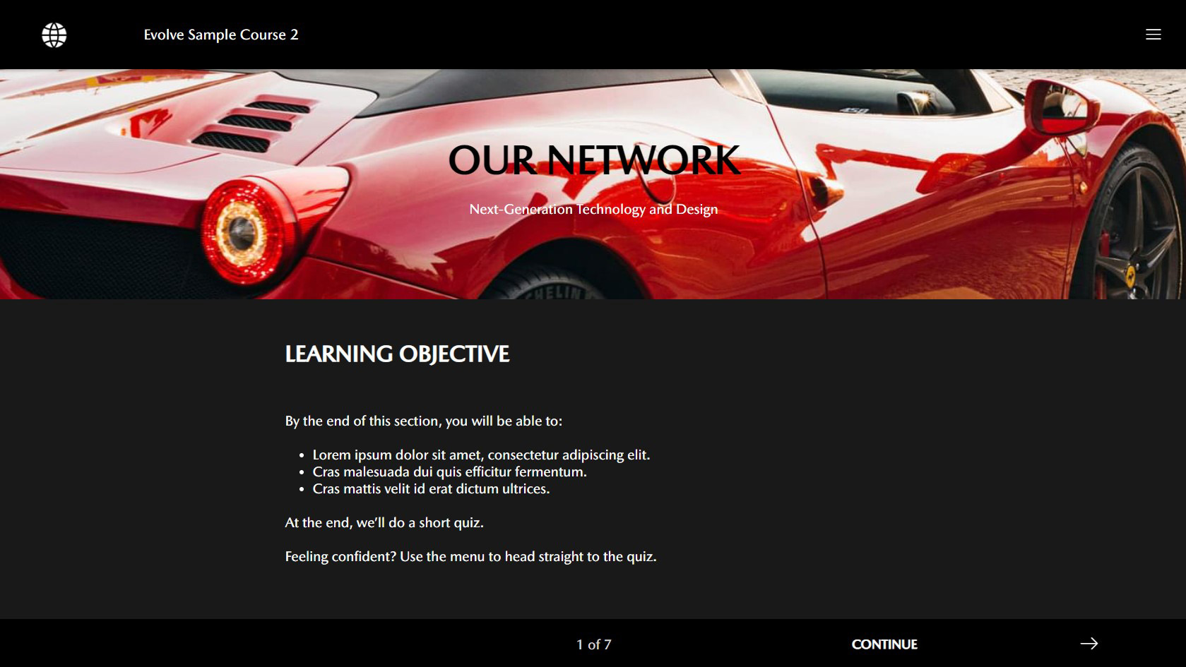 A responsive course created with Evolve. Interactions include hotspots, quizzes and a video. It uses local storage to remember your progress while not hosted on an LMS.